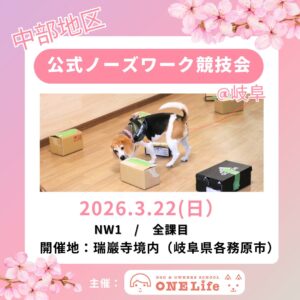 ワンライフ初主催のNW1公式ノーズワーク競技会を開催します!JNWSCのルールに則った練習をしていて、NW1の認識テストに受かっている方!ふるってご参加くださね 概要 【日時】2026年3月22日 9時~15時 (表彰式 […]
